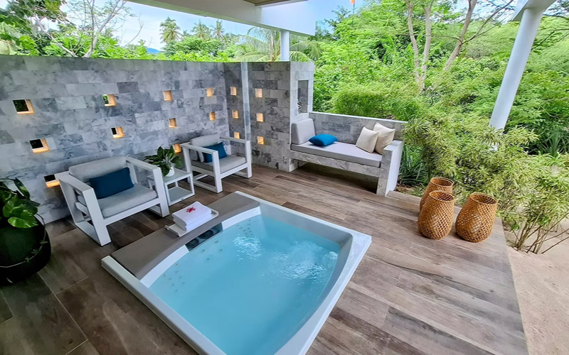North Two Villa is ideal for families or friends who want both space and connection, offering two en-suite bedrooms with their own unique features—one with direct access to a jacuzzi and the other with a wide terrace for outdoor dining. A private lounge creates a welcoming space to gather, while the villa’s expansive pool faces the horizon, giving guests front-row views of Banwa’s unforgettable sunsets.