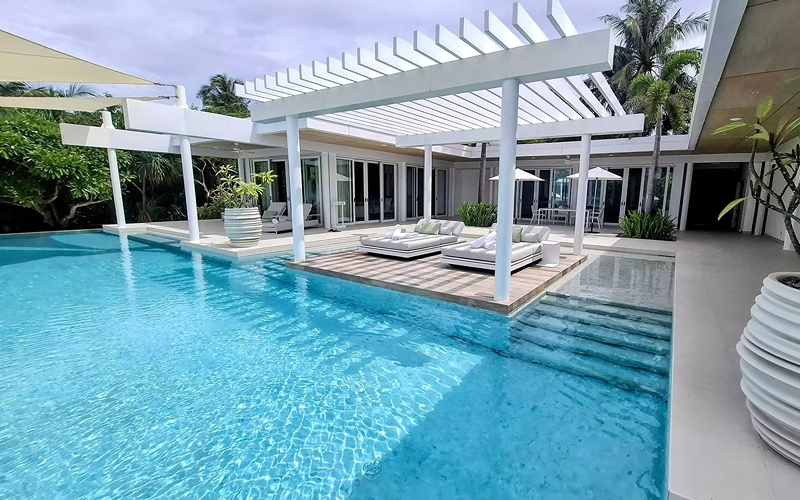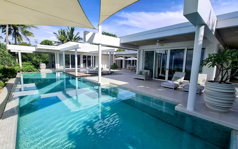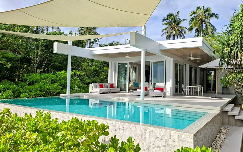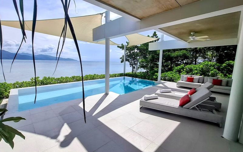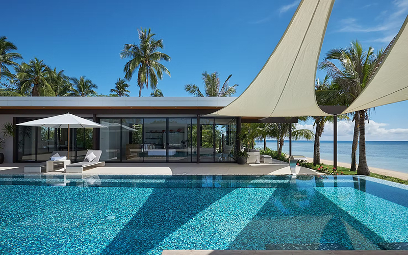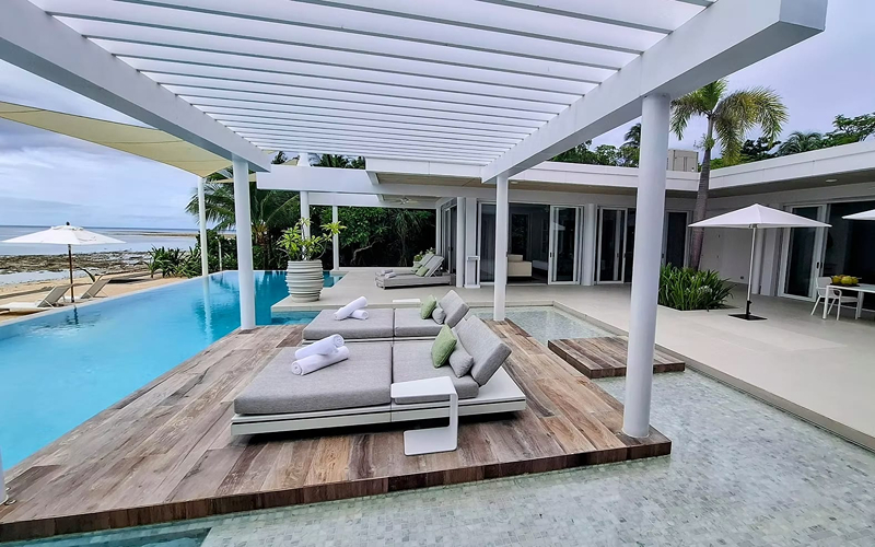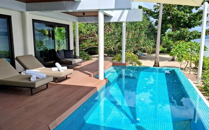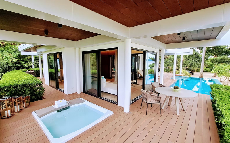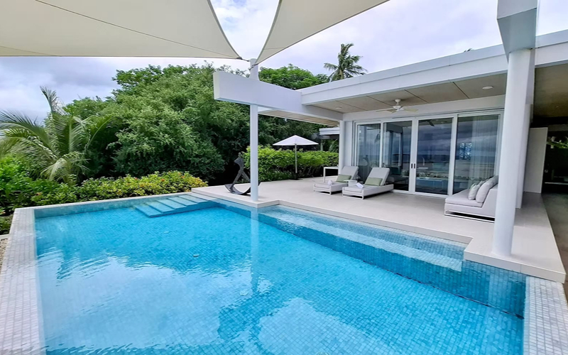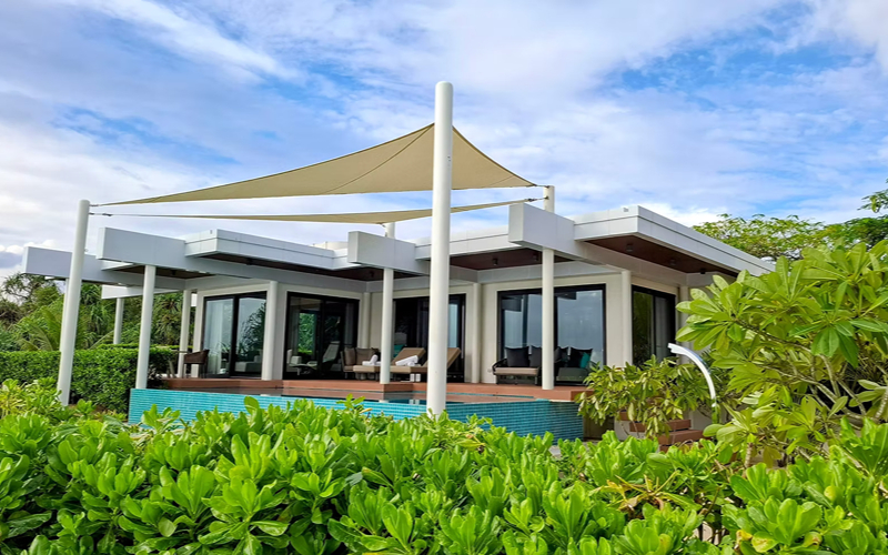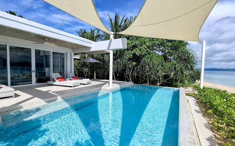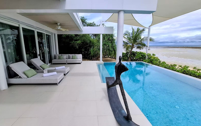 North East Villa sets itself apart with its elevated north-coast location, where guests can enjoy breathtaking sunrise views over the Sulu Sea. Designed by Mañosa & Company, it blends modern elegance with nature, featuring a private pool, reading deck, and beach shower alongside refined interiors with a lounge, dining area, and walk-in wardrobe—perfect for couples seeking intimacy and serenity.