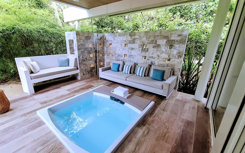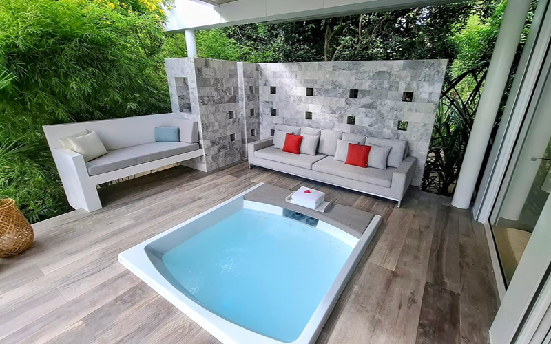 South One Villa doesn’t just provide a cozy escape—it’s a sanctuary for ultimate intimacy and direct ocean immersion. Nestled amid lush Bantigue trees, this villa features a large, integrated bedroom and lounge area, complete with a desk, fridge, coffee machine, and music system for effortless comfort. Its spacious bathroom leads straight to a private jacuzzi, a freshwater pool and an extensive terrace that merges into their own stretch of beach.