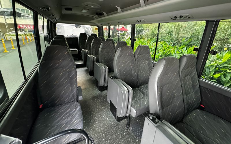 The Hyundai County available for rent is designed to comfortably accommodate up to 24 passengers, ensuring a spacious and enjoyable journey. With 19 regular seats and 5 middle seats, it allows passengers to exercise greater control over their seating preferences, enhancing accessibility and comfort for all. Additionally, the Coaster for rent in Manila offers considerable space to stow large & medium-sized luggage, ensuring that travelers can bring their essentials without compromising on legroom or convenience.