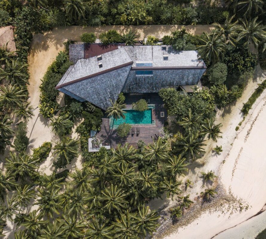Shared spaces include an open living area with sweeping views, a fully equipped kitchen, natural stone pool, outdoor terraces, private walkways, and quiet spots under coconut palms.