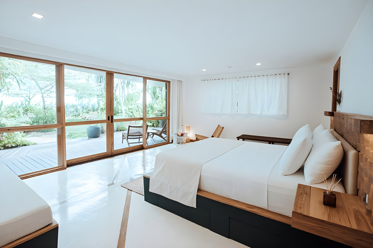 Maison Bukana offers four luxurious suites that accommodate up to eight guests (expandable to twelve). Each room features refined interiors, ensuite bathrooms, and views of either the lush gardens or serene river. Booking the entire villa ensures exclusive access to all amenities, including the infinity pool, open-air living spaces, and private beachfront.