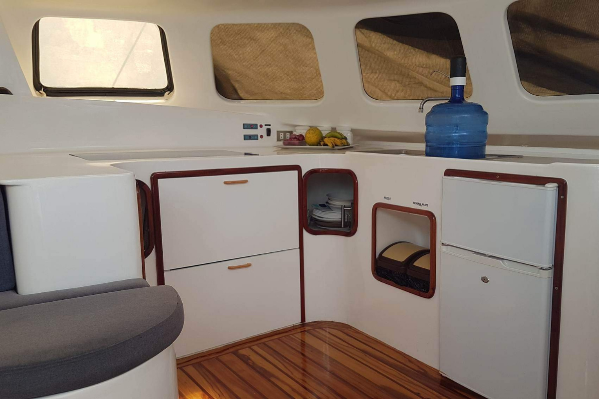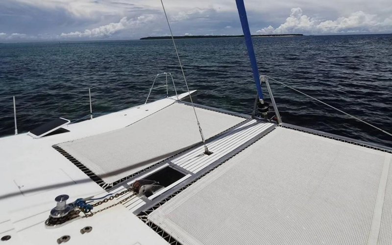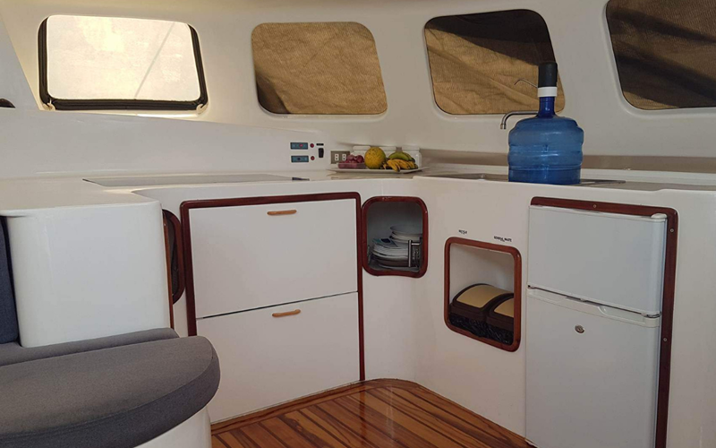 The catamaran’s wide open deck is ideal for al fresco dining, lounging, or simply soaking in the panoramic views of Siargao’s turquoise waters.
