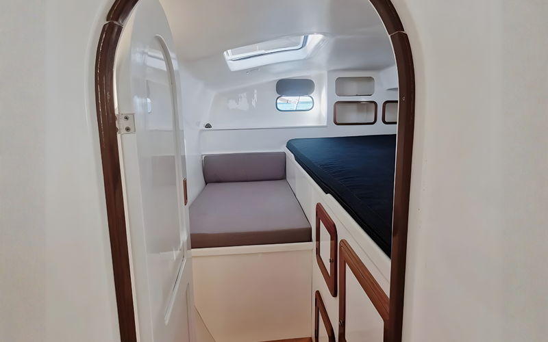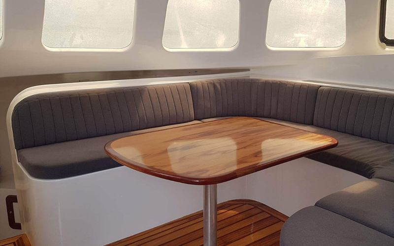 Unwind in the Moonpath Catamaran’s elegant saloon featuring plush seating, air conditioning, and modern interiors—perfect for cooling off or hosting an intimate gathering at sea.