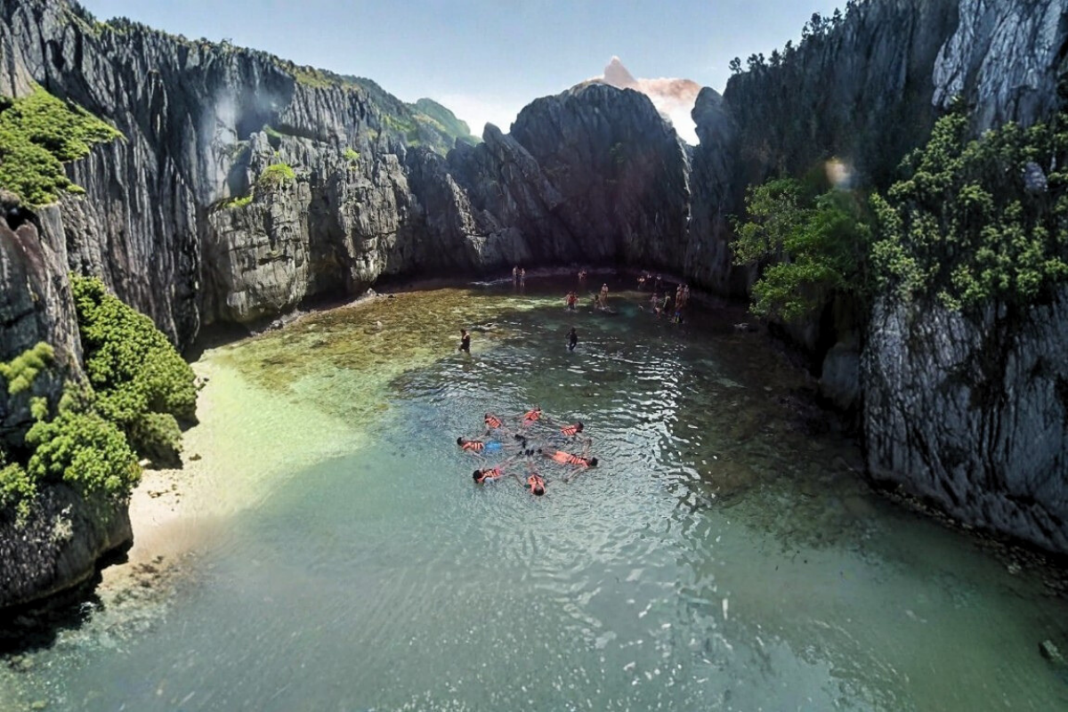 Hidden cove with towering limestone cliffs, crystal-clear waters, snorkeling opportunities |