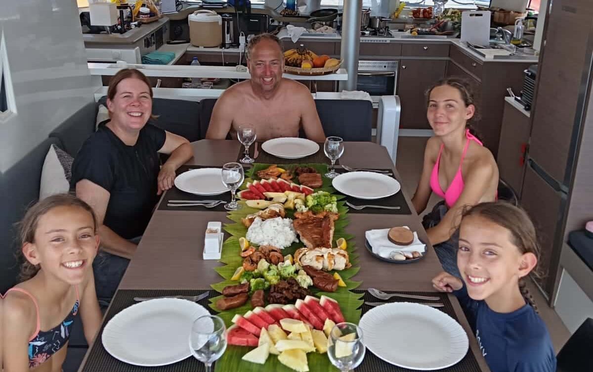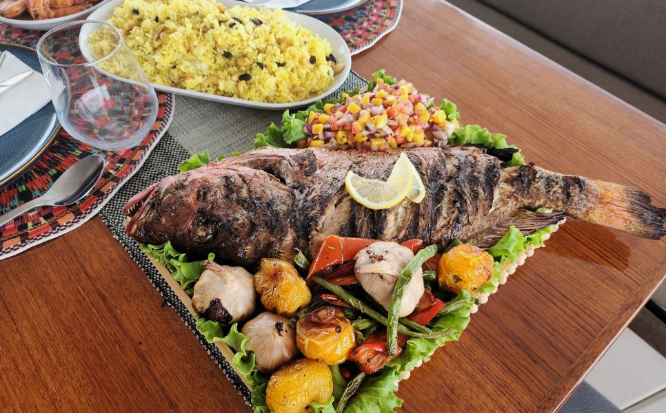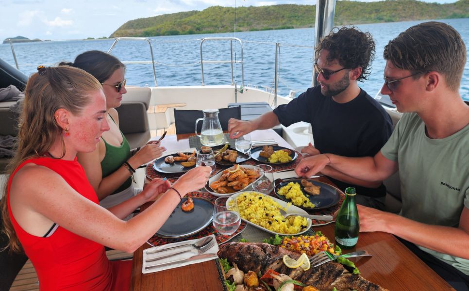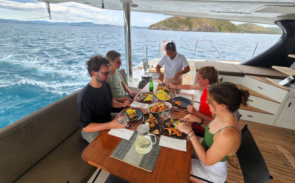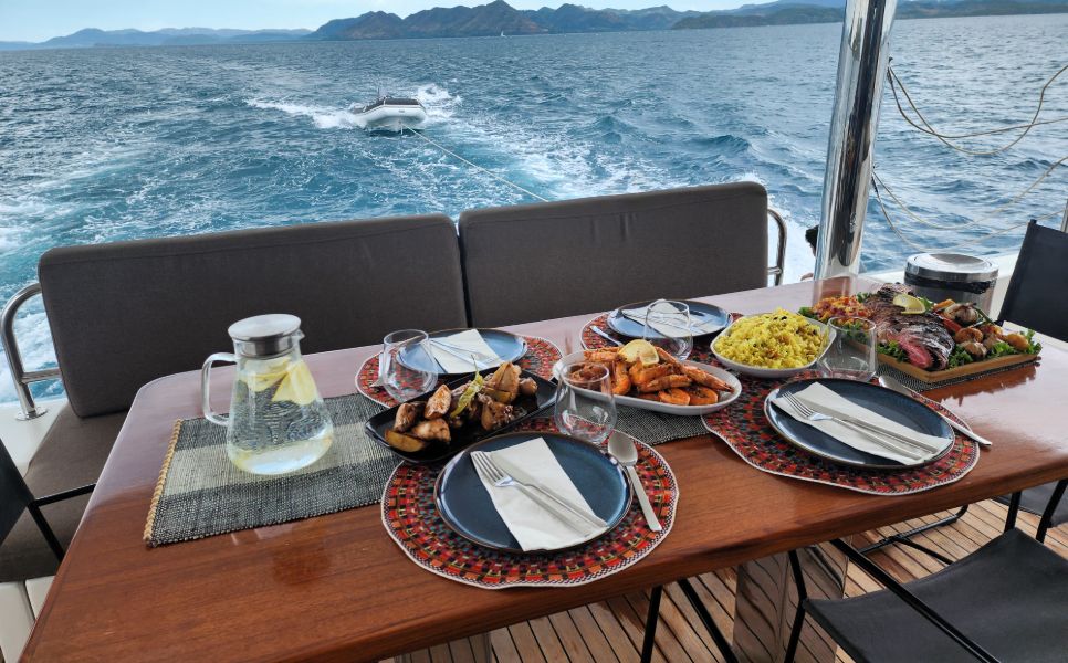 Aboard our luxury yachts, like the Sunreef, enjoy all-inclusive gourmet dining. Your private professional chef crafts full-board meals from a well-equipped kitchen featuring a BBQ, oven, and coffee amenities. We prioritize fresh, local seafood, often sourced directly from fishermen, for an unparalleled taste of the sea.