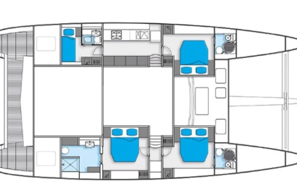 The Sunreef 60 features an impressive layout of four cabins, designed to house up to 6 guests. The yacht includes one expansive Master cabin, complete with a large bathroom and a queen-sized bed, complemented by windows offering stunning sea views. Additionally, there are two VIP cabins, each equipped with a queen bed and sea-facing windows, along with a more compact bathroom good for kids. The vessel also boasts a smaller cabin furnished with two bunk beds and its own private bathroom, good for kids.