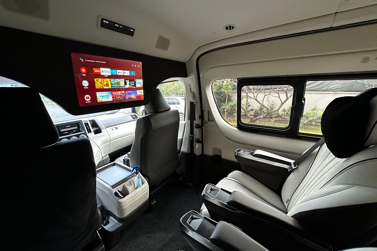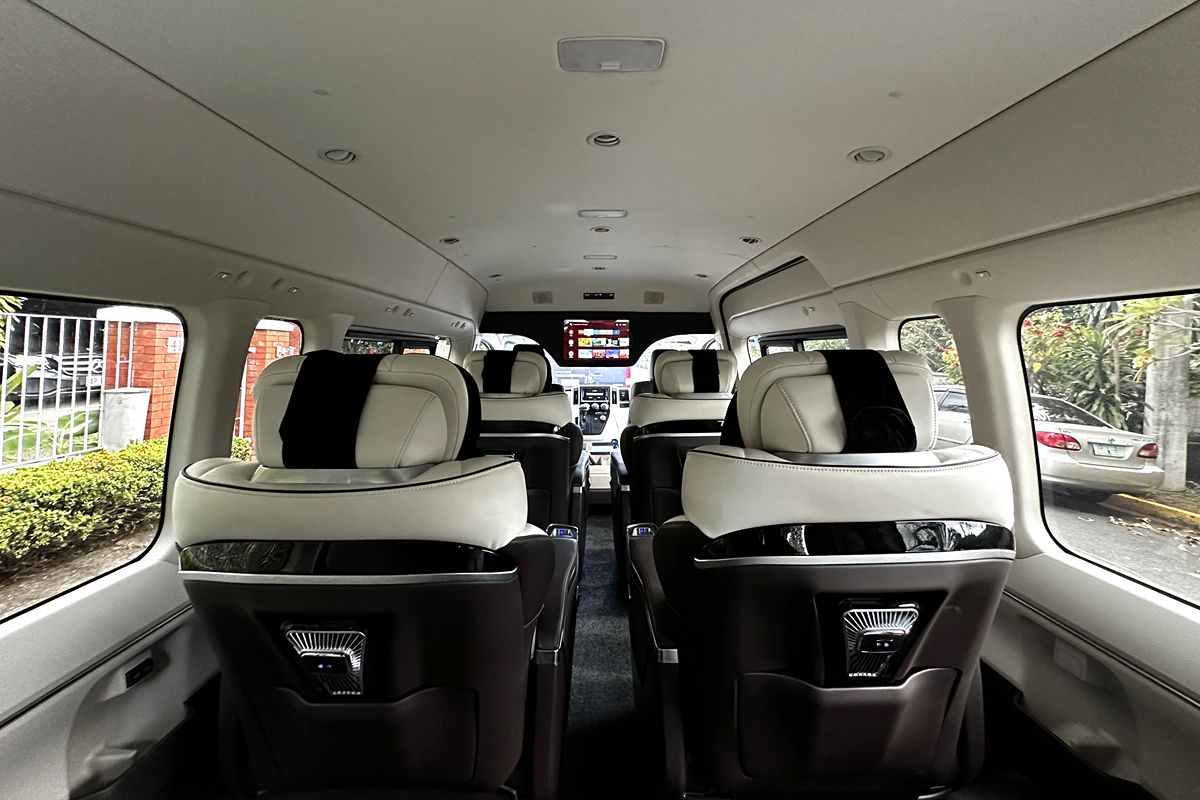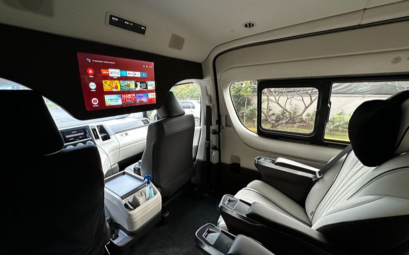 The Toyota Tourer Artista available for rent in Manila boasts four Maybach captain seats, with the flexibility of two movable seats, enabling passengers to tailor their seating arrangements for the utmost comfort and convenience on extended journeys. These seats are luxuriously crafted with massage function and spacious legroom, enhancing the overall riding experience.